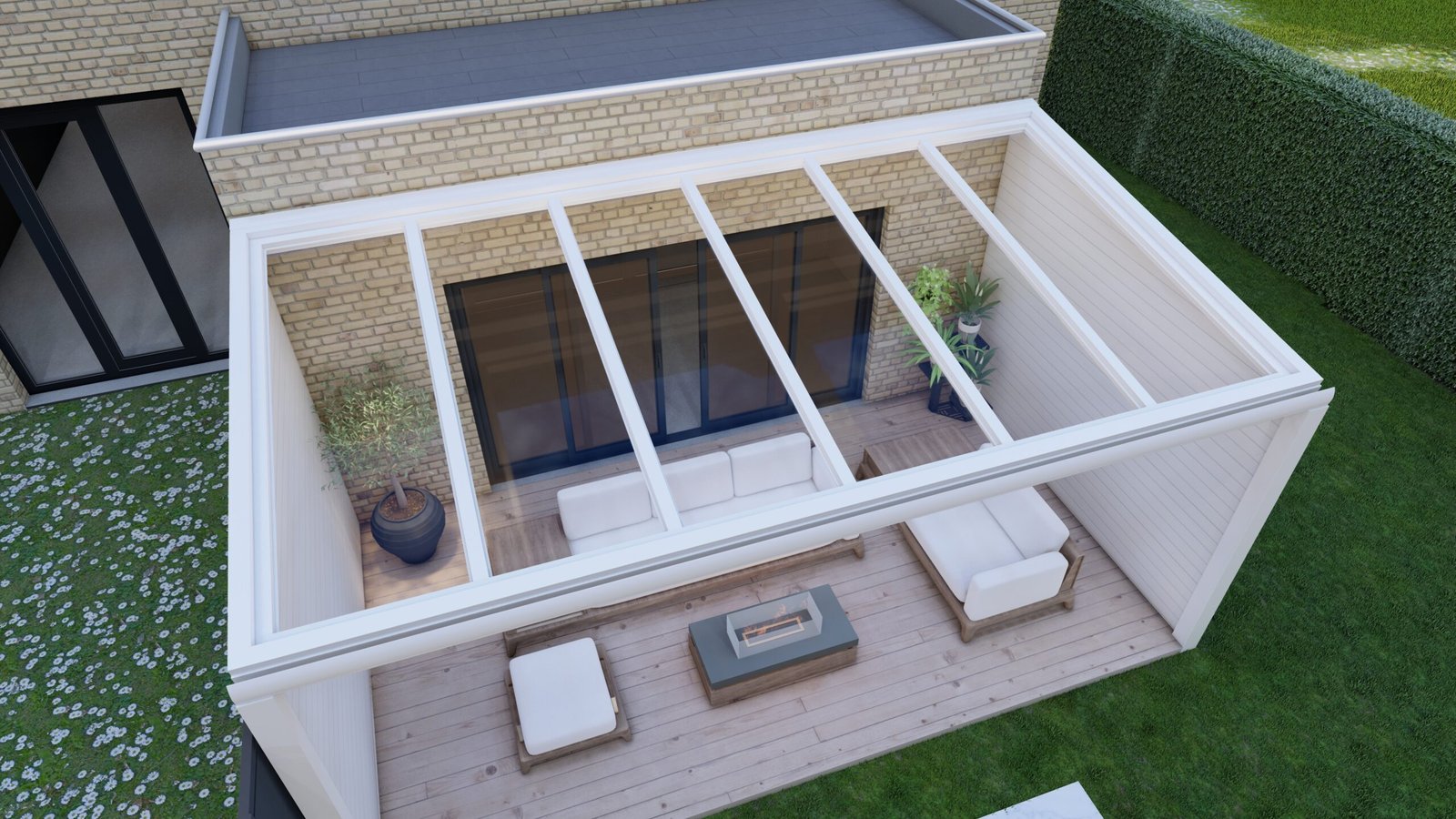 Kies uit moderne kleuren als RAL7016 antraciet, RAL9001 crème of RAL9016 wit. Met glas of polycarbonaat dak, schuifpuien en afmetingen vanaf 300 × 300 cm pas je de veranda aan jouw stijl aan.